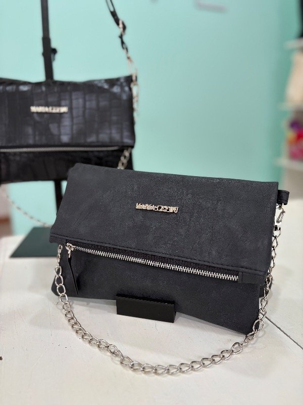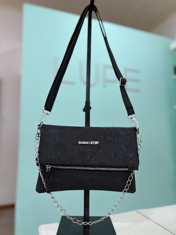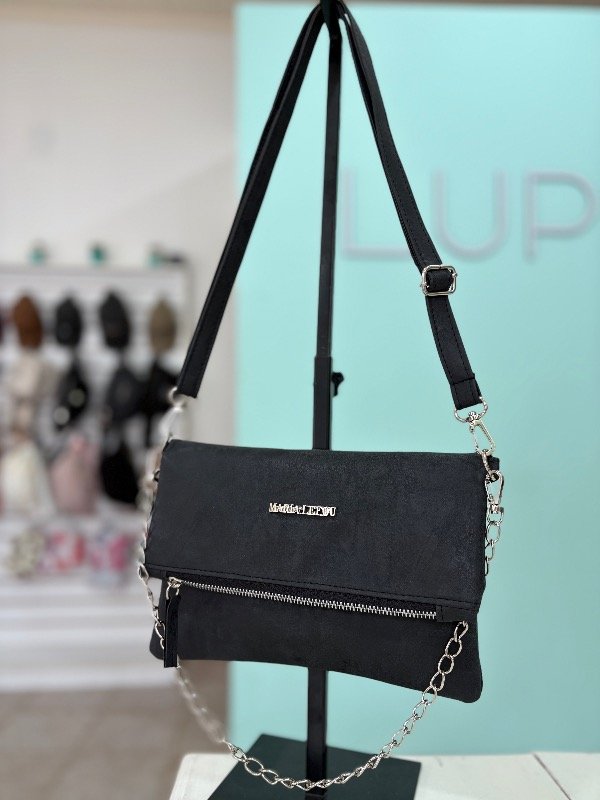 Diseñada con cuero sintético de alta calidad, su interior está forrado en un sofisticado color negro. Esta bandolera destaca por sus dos correas desmontables: una correa larga regulable de 1.30m y una correa corta de cadena, brindando versatilidad para diferentes ocasiones.